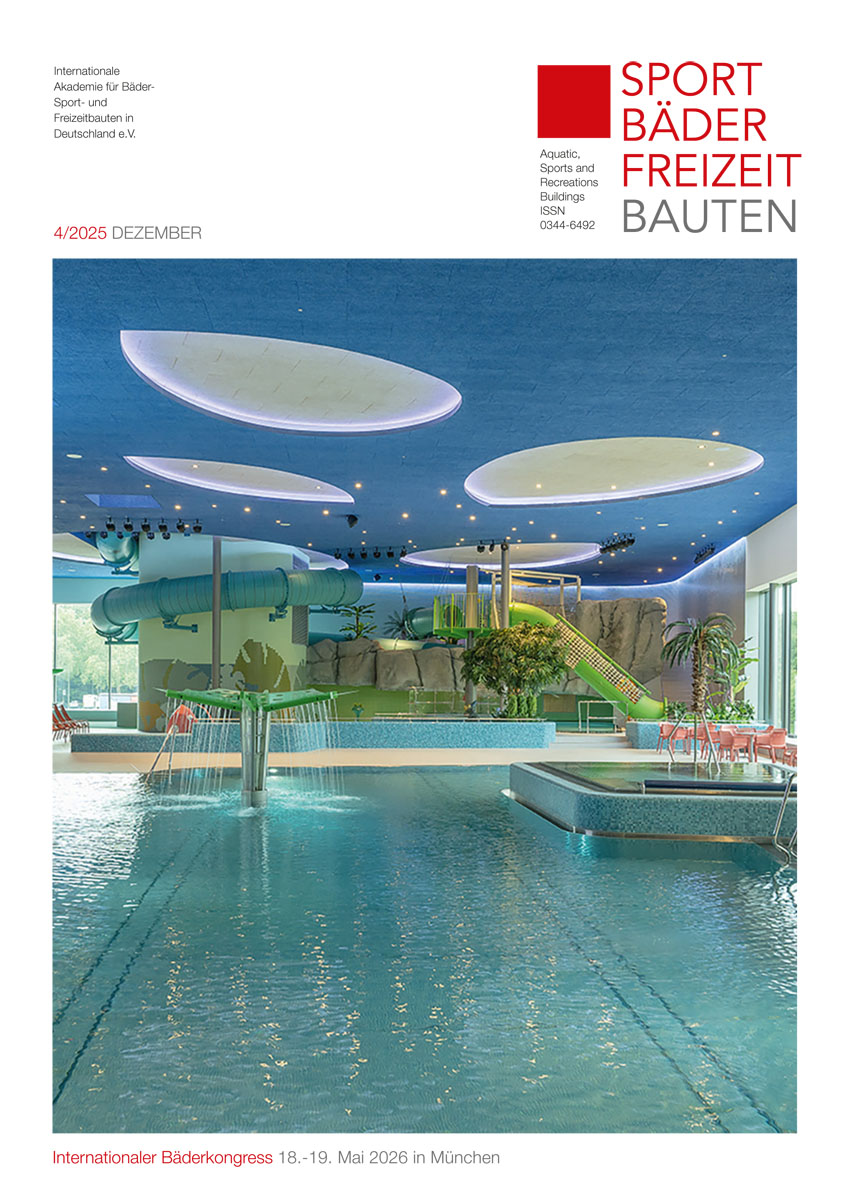 Die internationale Zeitschrift SPORT-BÄDER-FREIZEIT-BAUTEN befasst sich inhaltlich mit den Schwerpunktthemen Planung, Bau, Einrichtung, Betrieb, Wirtschaftlichkeit und Forschung von Freizeitbädern (Hallen- und Freibäder), Sauna, Privat-, Hotel-, Heil- und medizinische Bäder sowie Turn-, Spiel- und Sporthallen. Im aktuellen Magazin finden Sie redaktionelle Berichte u.a. zu folgenden Themen: